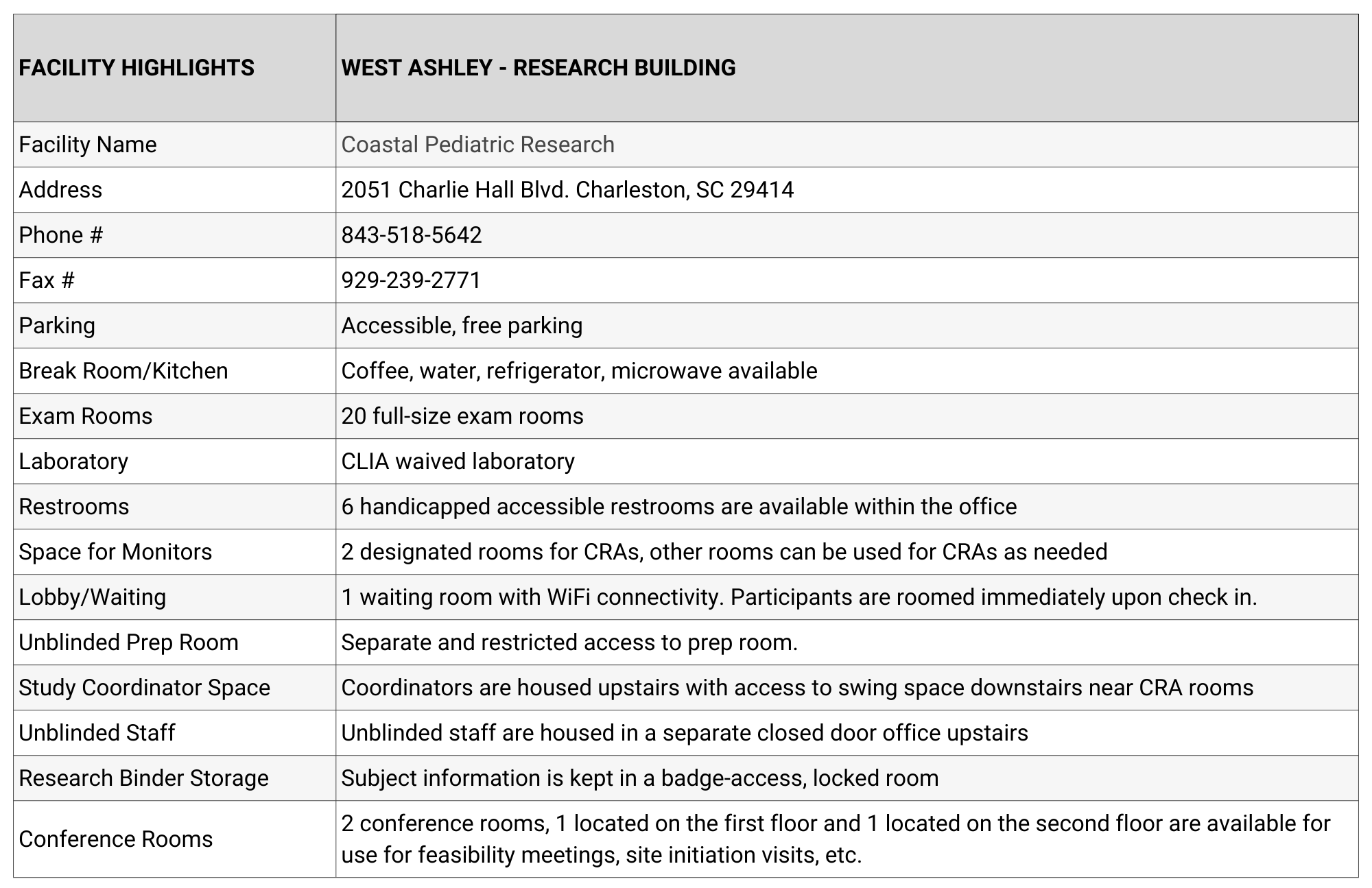 Coastal Pediatric Research is pleased to give you access to a new, state of the art multi-purpose building. From 20 full-service exam rooms to 2 large, fully-accessible conference rooms, we can accommodate more patients and CRAs than ever.